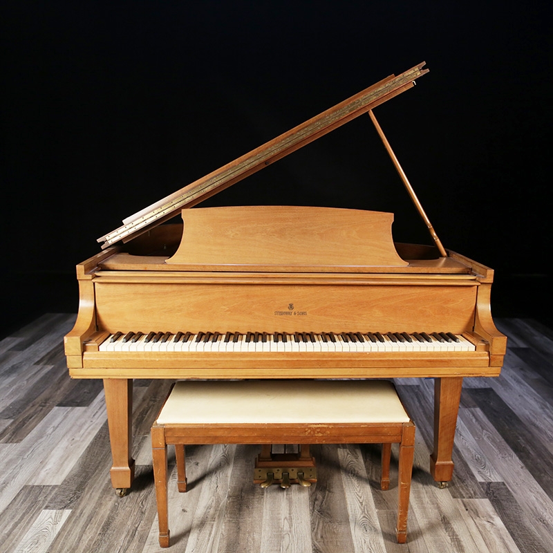 This Steinway Model M will be fully restored and the traditional style walnut case will be finished with a stain of your choice (or satin ebony). Includes a matching wood top bench.