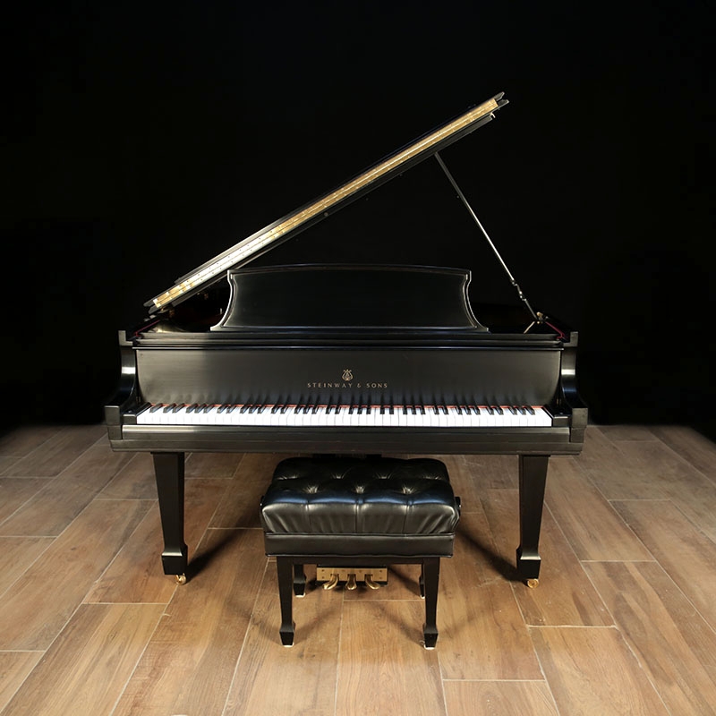 This Steinway Model M is in classic satin ebony and has a traditional case. Includes a matching bench.