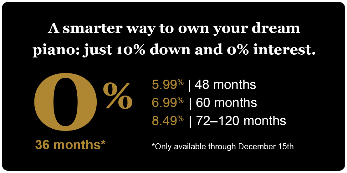 Now through December 15th, we’re offering 0% financing for 36 months with 10% down on all Steinway piano purchases. The rate will then return to 0% for 18 months afterwards.