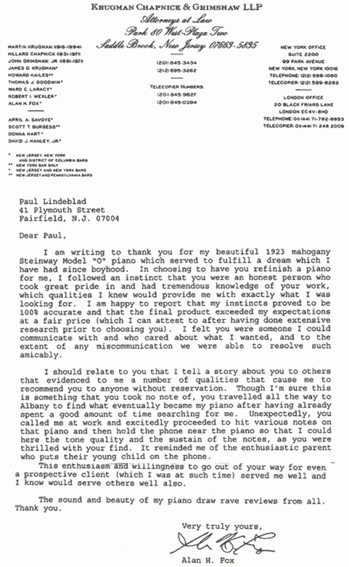 I am writing to thank you for my beautiful 1923 mahogany Steinway Model O piano which served to fulfill a dream which I have had since boyhood. In choosing to have you refinish a piano for me, I followed an instinct that you were an honest person who took great pride in and had tremendous knowledge of your work, which qualities I knew would provide me with exactly what I was looking for. I am happy to report that my instincts proved to be 100% accurate and that the final product exceeded my expectations at a fair price (which I can attest to after having done extensive research prior to choosing you). I felt you were someone I could communicate with and who cared about what I wanted, and to the extent of any miscommunication we were able to resolve such amicably.
