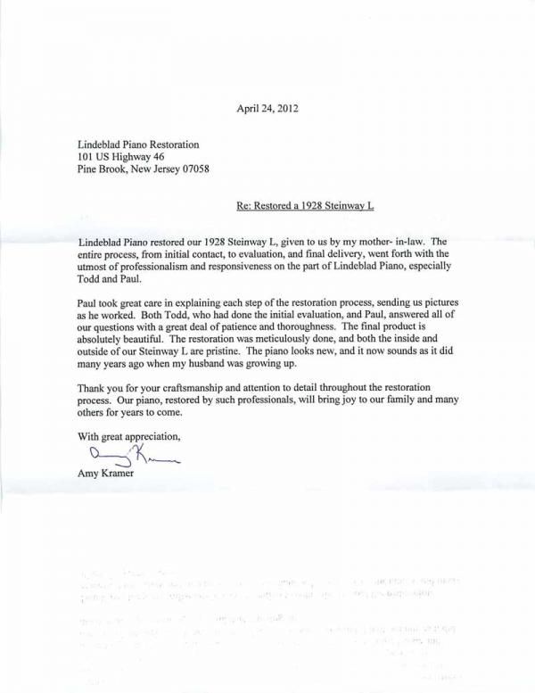 Lindeblad Piano restored our 1928 Steinway L, given to us by my mother- in-law. The entire process, from initial contact, to evaluation, and final delivery, went forth with the utmost of professionalism and responsiveness on the part of Lindeblad Piano, especially Todd and Paul.