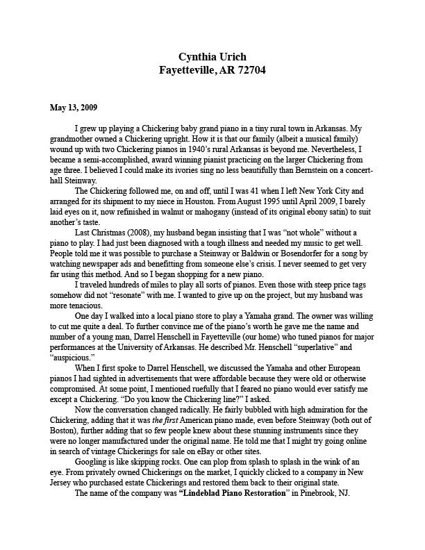 At some point, I cancelled a flight to New York, previously booked at my husband’s urging, to go up and play the piano myself for full and final reassurance that this particular piano did, indeed, produce the singular sound grooved indelibly in my brain.Q: Why would I cancel a personal encounter with such a valuable instrument before committing to own it, place it my home, and teach my daughter to play on it? A: Because I trusted my ear, I trusted Paul Lindeblad, and I trusted the Chickering.