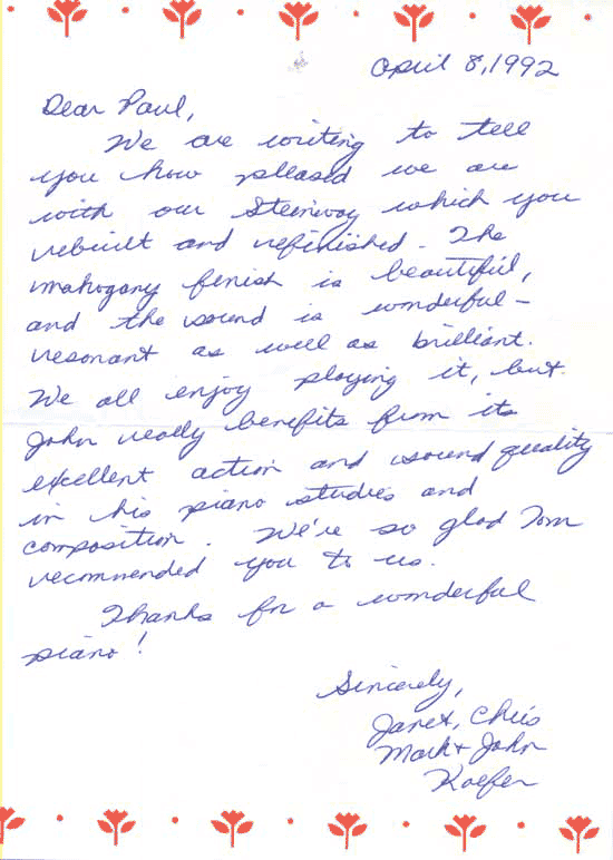 We are writing to tell you how pleased we are with our Steinway which you rebuilt and refinished. The mahogany finish is beautiful, and the sound is wonderful--resonant as well as brilliant. We all enjoy playing it, but John really benefits from its excellent action and sound quality in his piano studies and composition. We're so glad Tom recommended you to us.