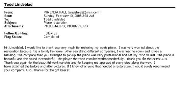 I would like to thank you very much for restoring my aunts piano. I was very worried about the restoration because it is a family heirloom. After searching different companies, I was led to your and it was a blessing. The company that you arranged to pick up the piano was very professional and set my mind to rest. The piano is beautiful and the sound is wonderful. The player that was installed works wonderfully. Thank you for the extra CD's. Thank you again for the beautiful workmanship and for keeping me apprized of every step along the way. I have attached the before and after pictures. If I knew of anyone that needed a restoration, I would surely recommend your company. Thanks for the gift basket.