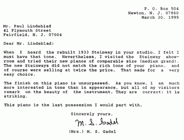 When I heard the rebuilt 1933 Steinway in your studio, I felt I must have that tone. Nevertheless, I visited the Steinway showroom and tried their new pianos of comparable size (medium grand). The new Steinways did not match the rich tone of your piano, and of course were selling at twice the price. That made for a very easy choice.