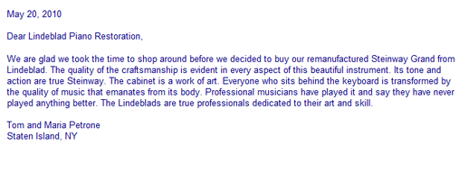 We are glad we took the time to shop around before we decided to buy our remanufactured Steinway Grand from Lindeblad. The quality of the craftsmanship is evident in every aspect of this beautiful instrument. Its tone and action are true Steinway. The cabinet is a work of art. Everyone who sits behind the keyboard is transformed by the quality of music that emanates from its body. Professional musicians have played it and say they have never played anything better. The Lindeblads are true professionals dedicated to their art and skill.