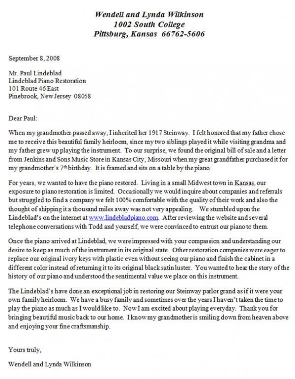 For years we wanted to have the piano resorted. Living in a small Midwest town in Kansas, our exposure to piano restoration is limited. Occasionally we would inquire about companies and referrals but struggled to find a company we felt 100% comfortable with the quality of their work and also the thought of shipping it a thousand miles away was not very appealing. We stumbled upon the Lindeblad's on the internet at www.lindebladpiano.com. After reviewing the website and several telephone conversations with Todd and yourself, we were convince to entrust our piano to them.